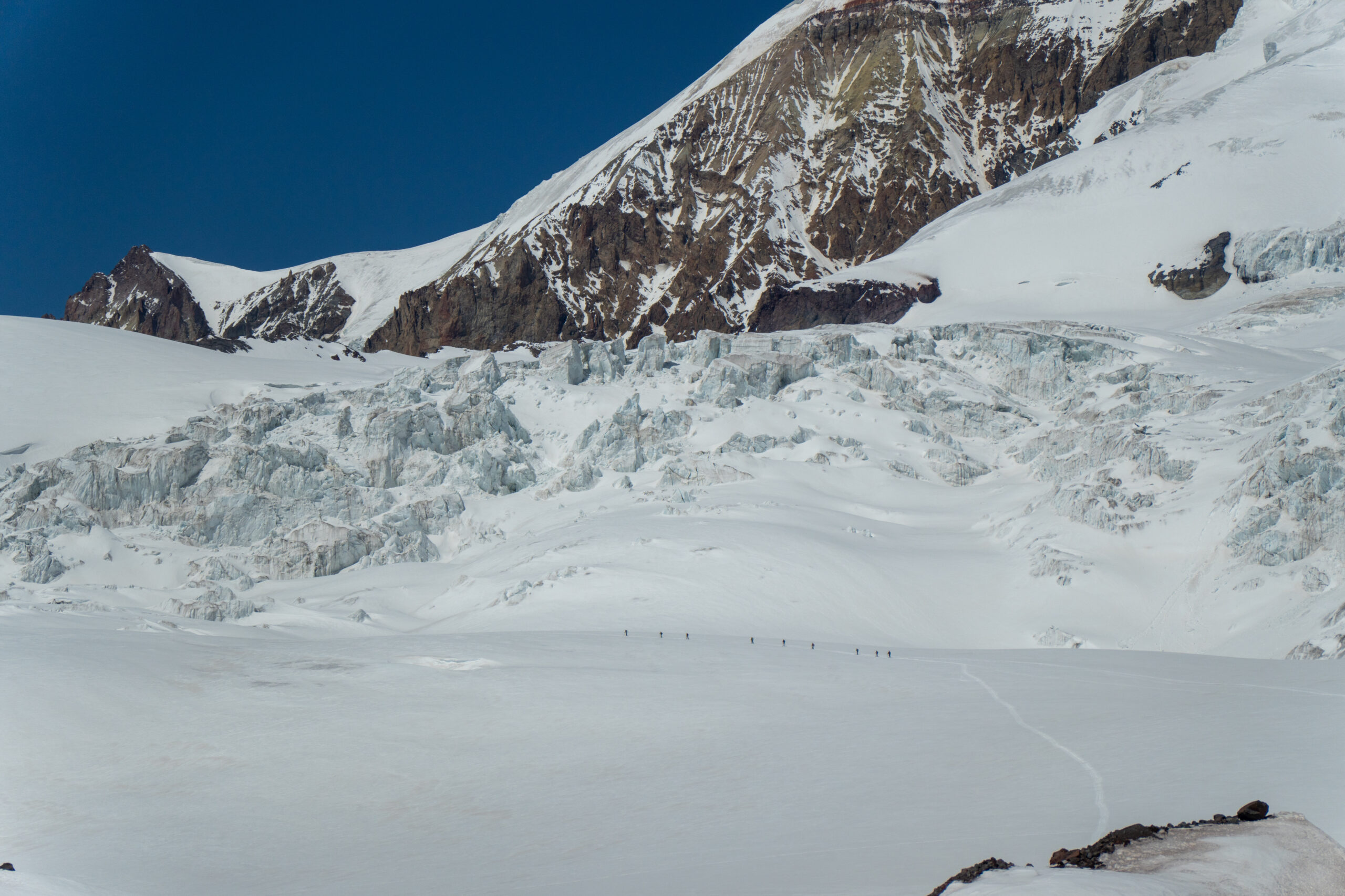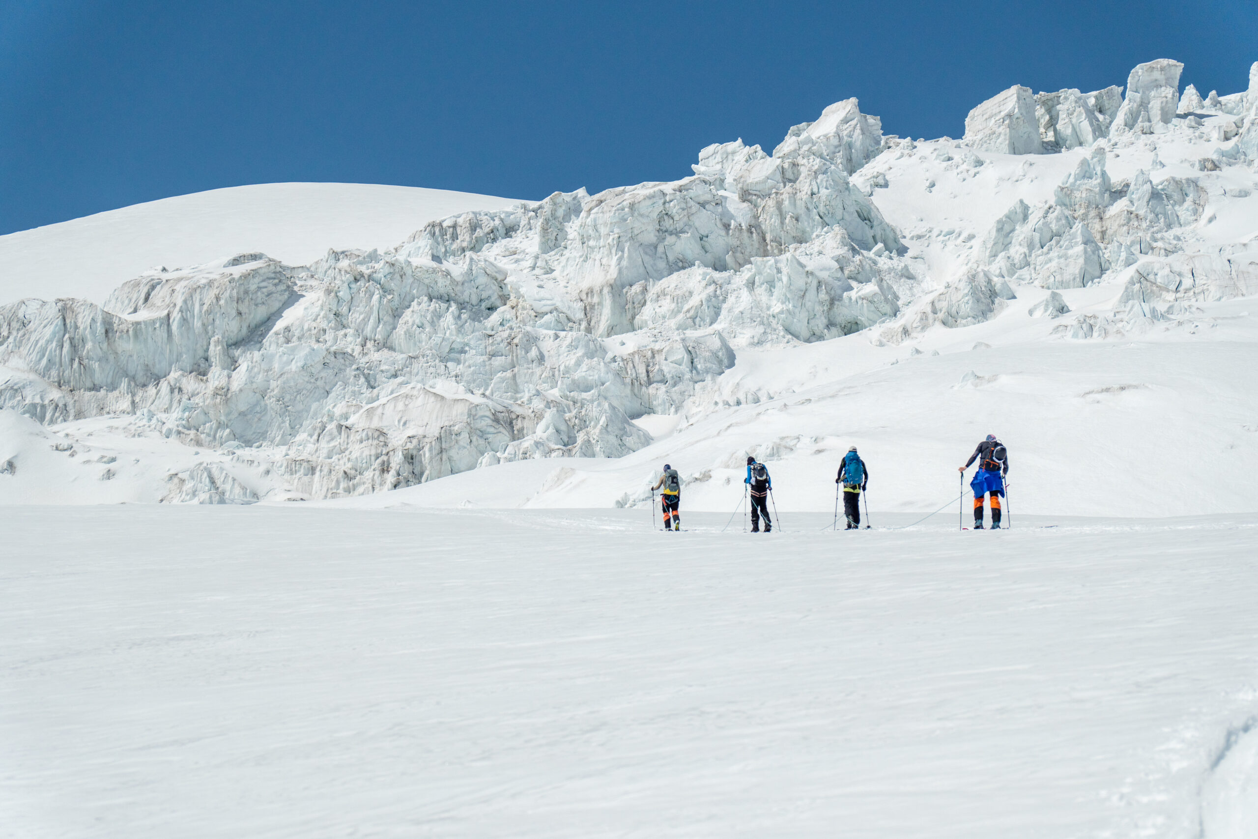 В то время, когда в долине уже наступает самая настоящая весна, на высоте на ледниках Эльбруса сохраняются хорошие снежные условия для скитура и весеннего катания. Главное — не забывать активно мазаться солнцезащитным кремом и успевать насладиться красотой.