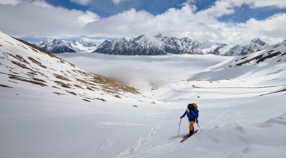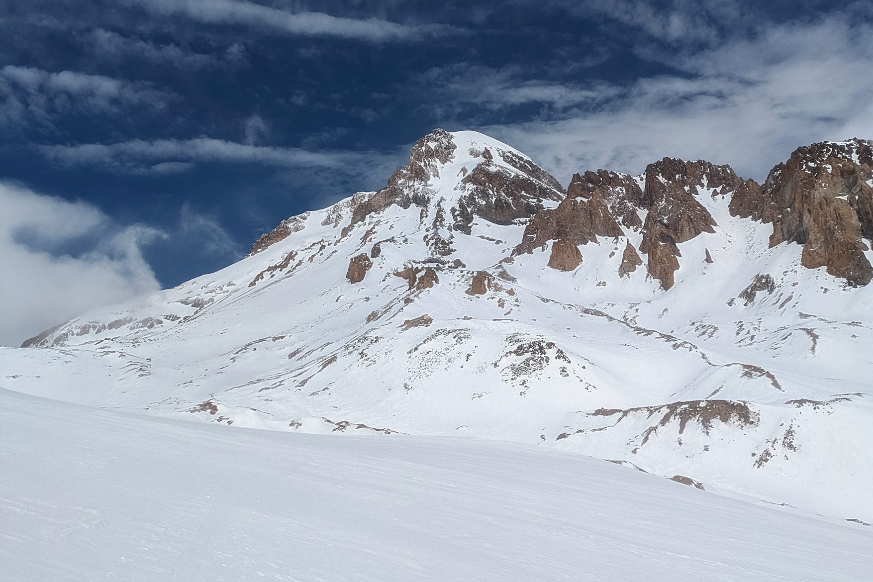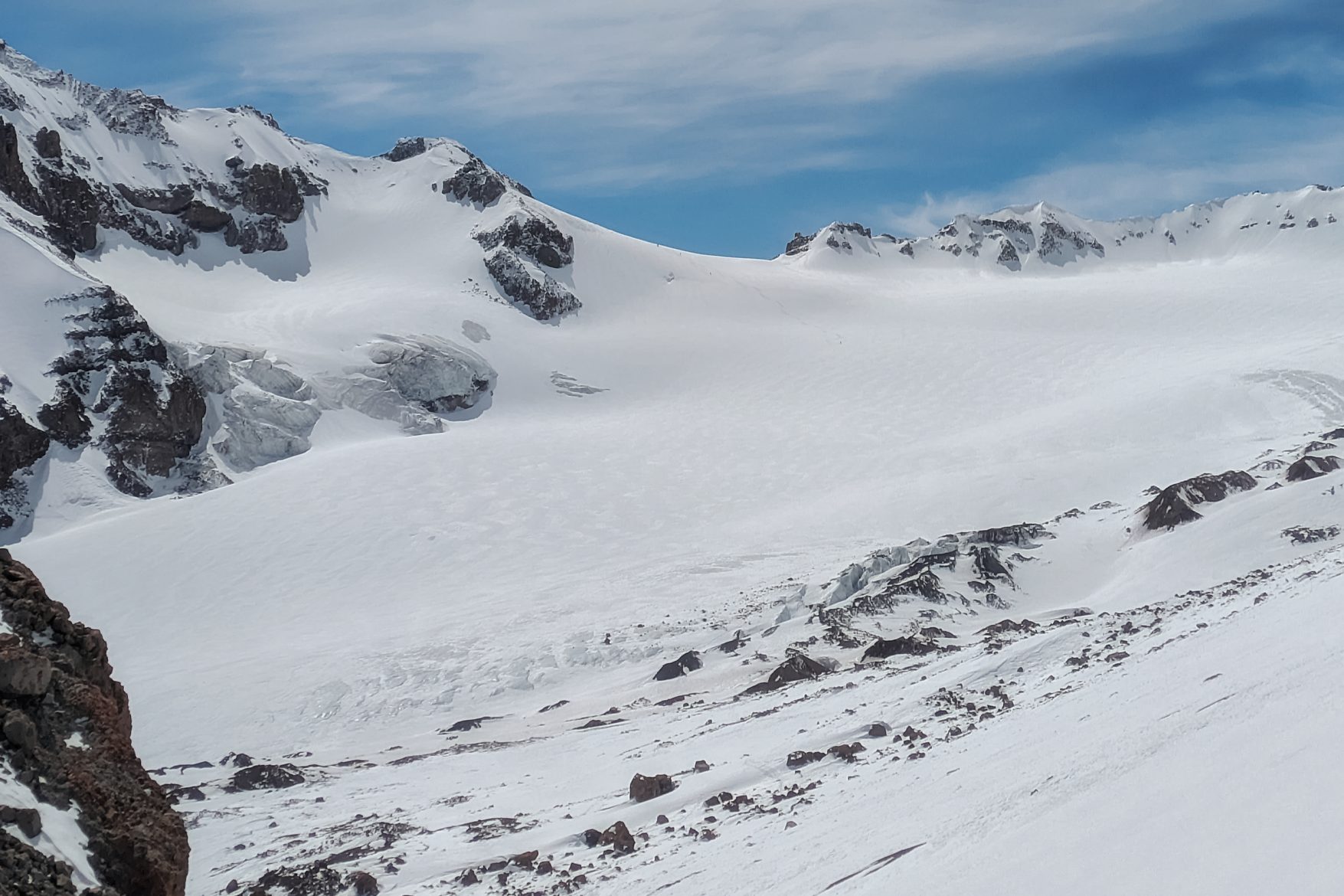 Проживание в горных хижинах на высотах 3000м. Скитур и катание с близлежащих склонов. Рельеф: ледники и кулуары. Растительность отсутствует.