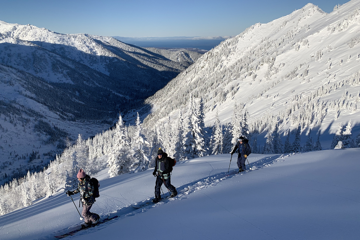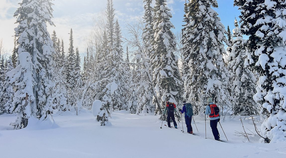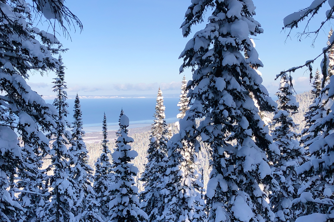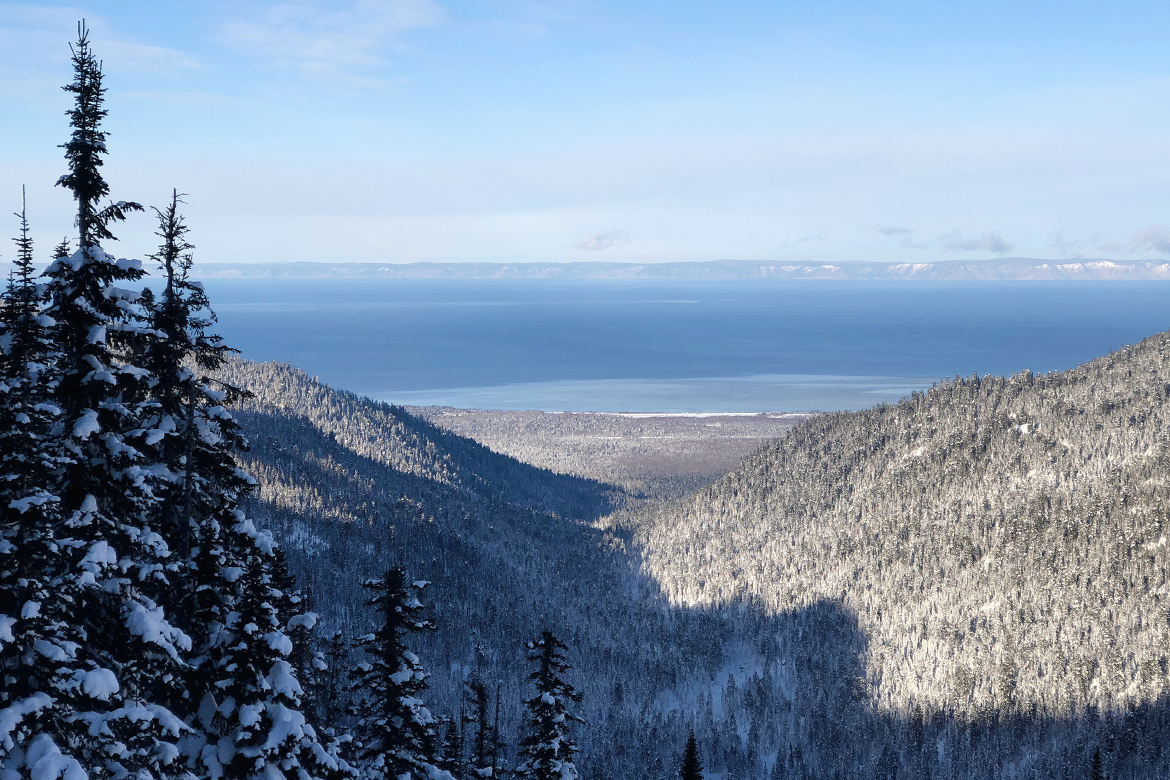 Новогодняя скитурная программа в Мамайском ущелье — это мягкий глубокий снег, тишина заснеженной тайги и виды на Байкал.