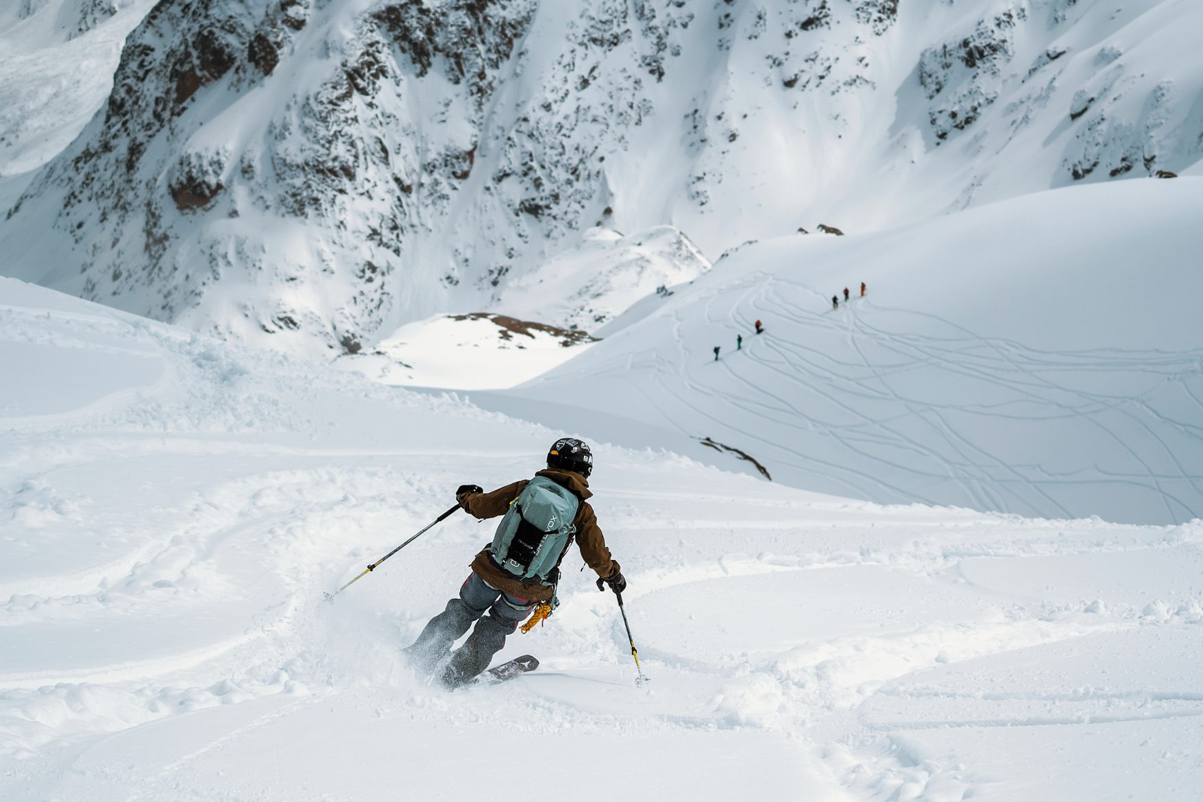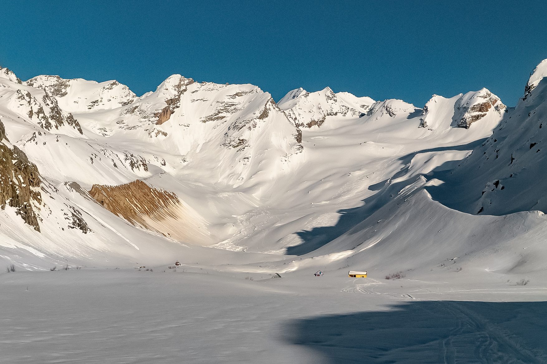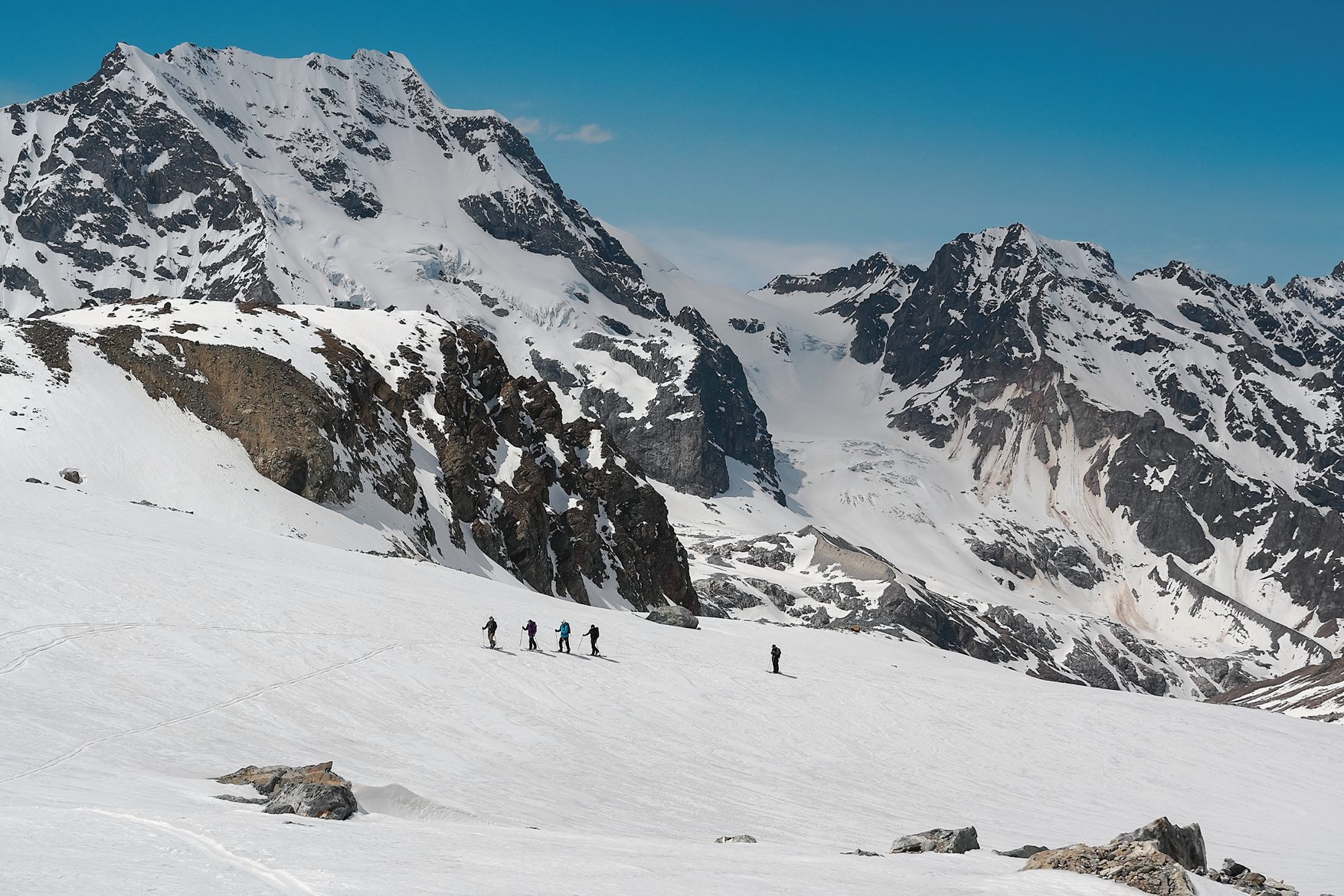 Проживание в горных хижинах на высотах 2300-2600м. Скитур и катание с близлежащих перевалов 3500 — 4000м. Рельеф: ледники и кулуары. Растительность редкая или отсутствует.