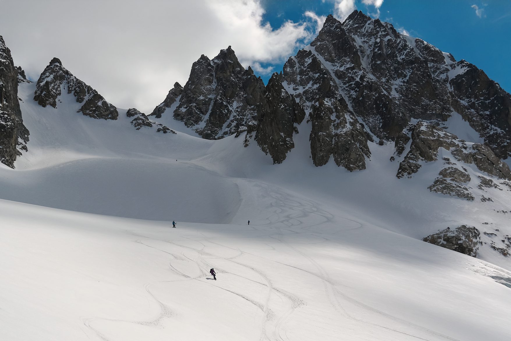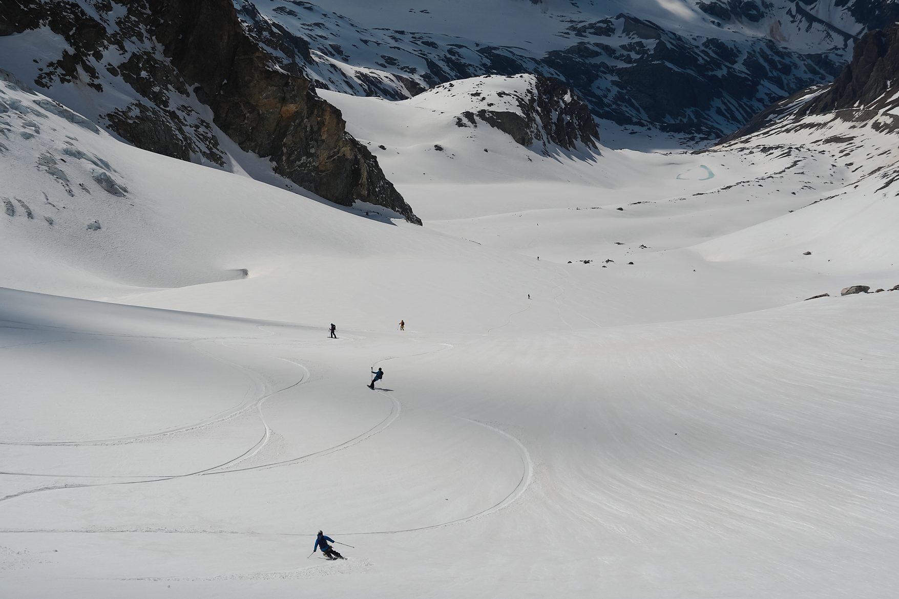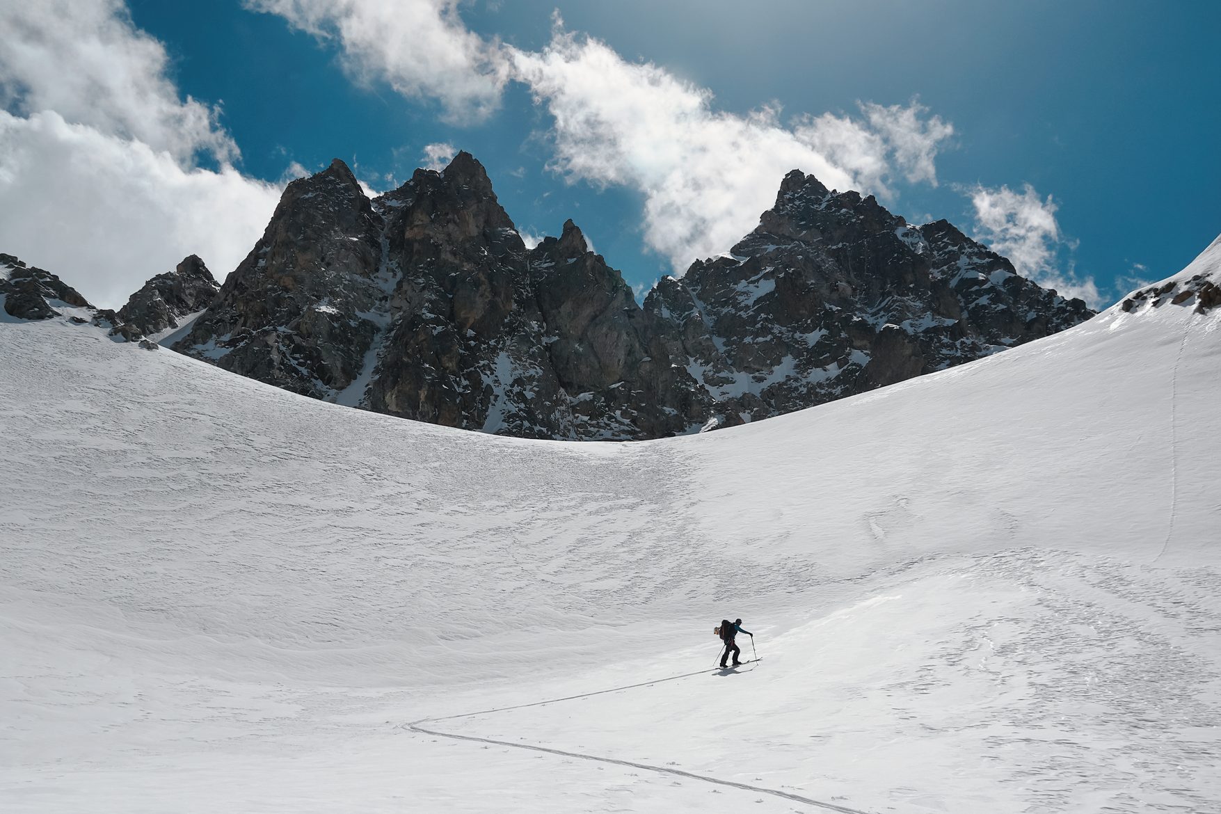 Проживание в горных хижинах на высотах 2300-2600м. Скитур и катание с близлежащих перевалов 3500 — 4000м. Рельеф: ледники и кулуары. Растительность редкая или отсутствует.