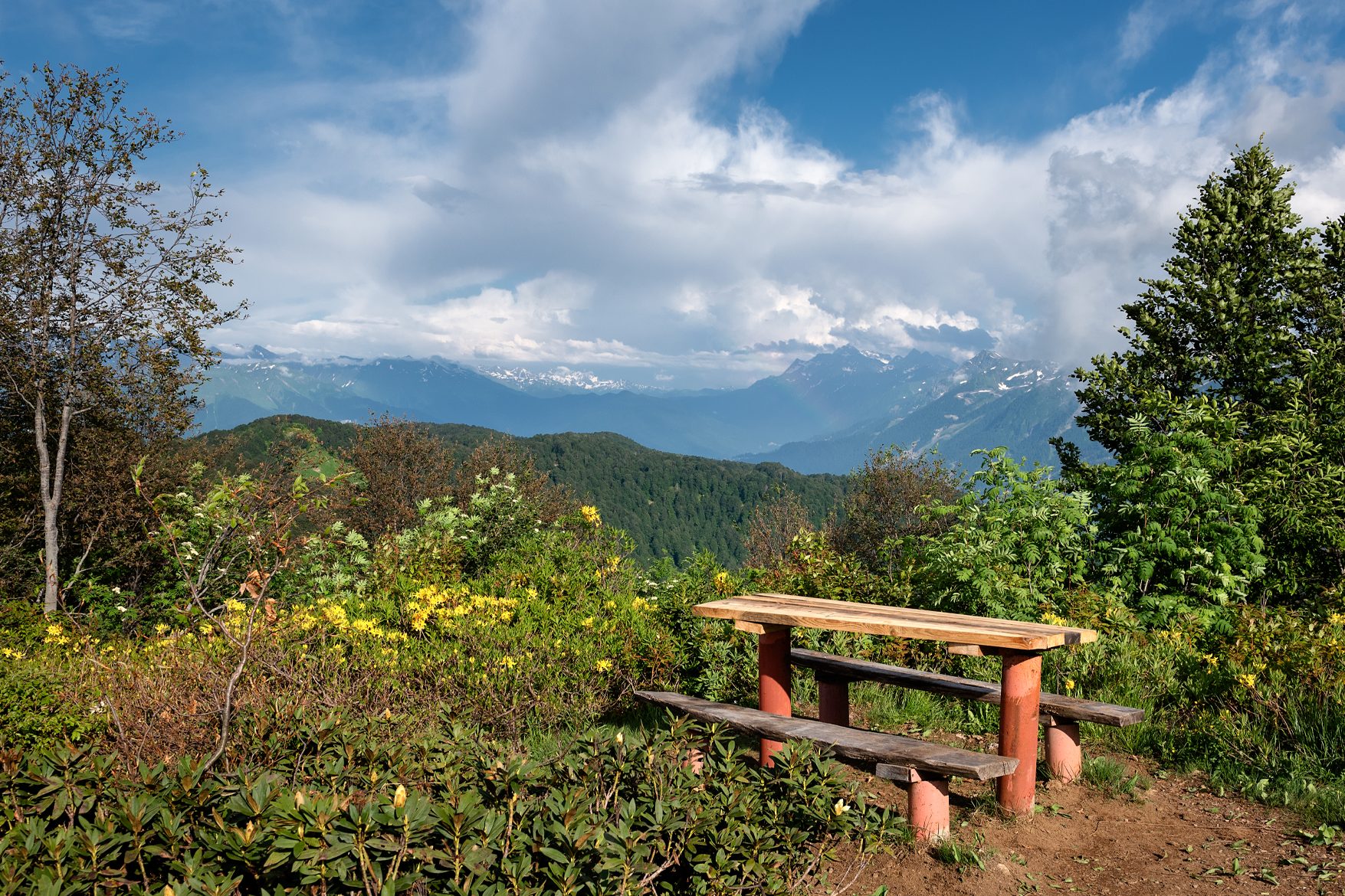 Начинается маршрут в поселке Красная Поляна и идет вдоль реки Бешенка. Первая достопримечательность — мегалитические сооружения – дольмены (2-3 тыс. до н.э.), еще чуть дальше замечательное место для отдыха с купелью. От купели тропа становится заметно круче и ведет по буковому лесу все выше и выше. Прекрасные фотографии с видом на Красную Поляну можно сделать на Поляне с Камнем. Дальше тропа выводит на пологий хребет с небольшим озером Зеркальное в котором водятся краснокнижные тритоны. Неподалеку расположена смотровая площадка с одними из самых шикарных панорамных видов 360°. Если еще есть силы, то можно прогуляться до Ачипсинских водопадов, высота которых до 30 метров. Протяженность маршрута 13,5 км, набор высоты 1250 м, продолжительность 8-9 ч.