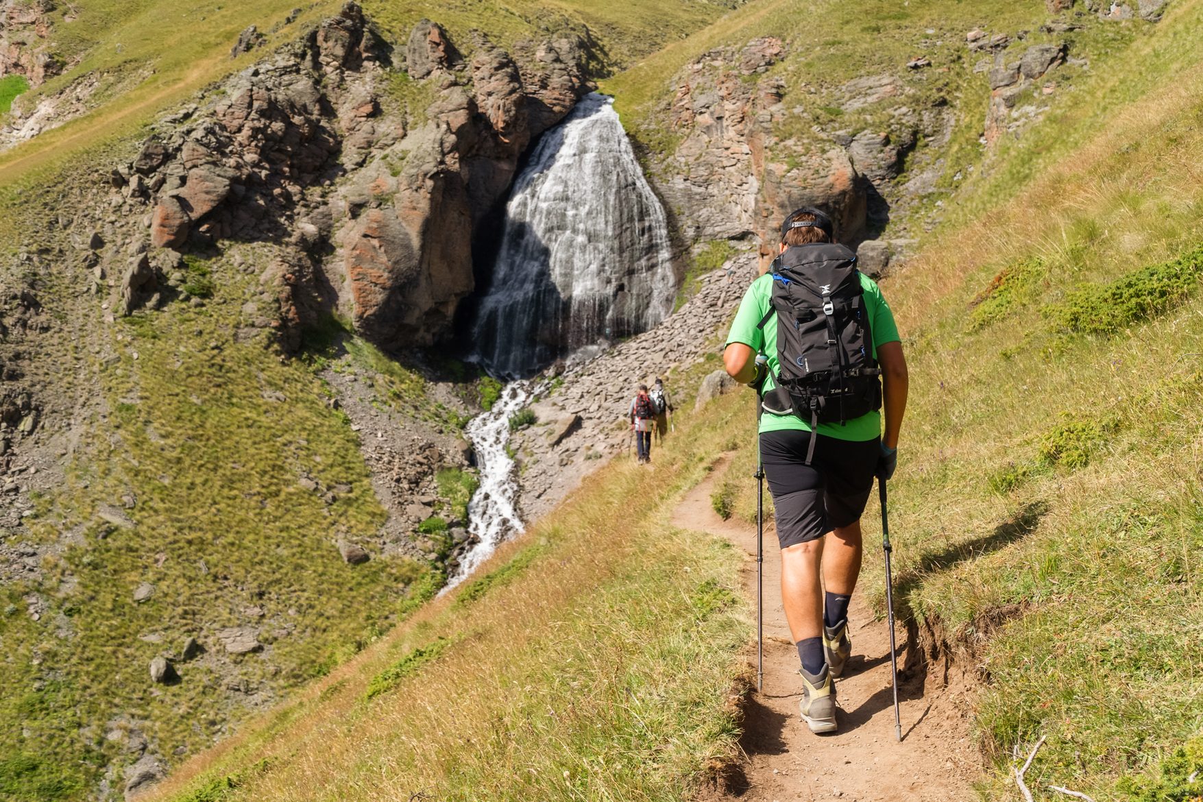 Начать можно от Чегетской Поляны 2100м или из поселка Терскол. Дорога проходит под северными склонами горы Чегет и вдоль реки Баксан. Водопад Азау течет с эльбрусских ледников и падает с отвесной стены одноименного ущелья. Протяженность около 11 км, набор высоты 300м, продолжительность около 4 часов. Простой маршрут.